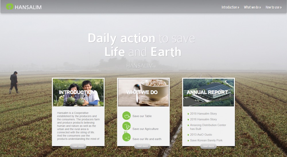 Hansalim創立於1986年,是以生產者與消費者為中心所共同成立的非營利組織,希望透過城鄉直接交易運動,建構一個永續的生產—消費系統。Hansalim是由兩個韓國字所組成的,「한(han)」代表「一、全部」,也意指地球上的生物,而「살림(salim)」則有「照顧家人的工作」與「恢復生命」的意義,兩個字組合起來就是「拯救所有的生命」。