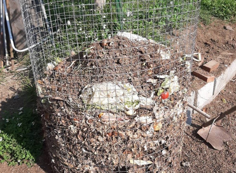 循環再利用,巫先生以鐵網圈出了一個一米直徑的空間,以乾、溼、乾、溼的順序層層堆疊,因為通風良好,不用翻堆,兩個月左右就能腐熟,形成良好的堆肥。