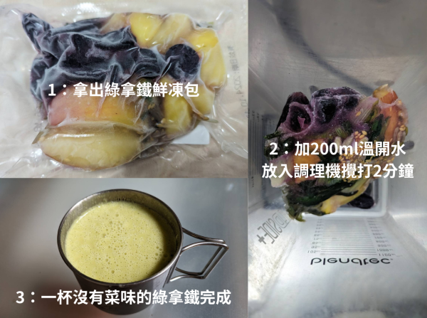 享用方式:1.拿出綠拿鐵鮮凍包,打開包裝,放入食物調理機(建議使用20,000轉以上),2.加入約220ml溫開水,攪打2分鐘,在家就能享用健康營養的綠拿鐵(大約500ml)。